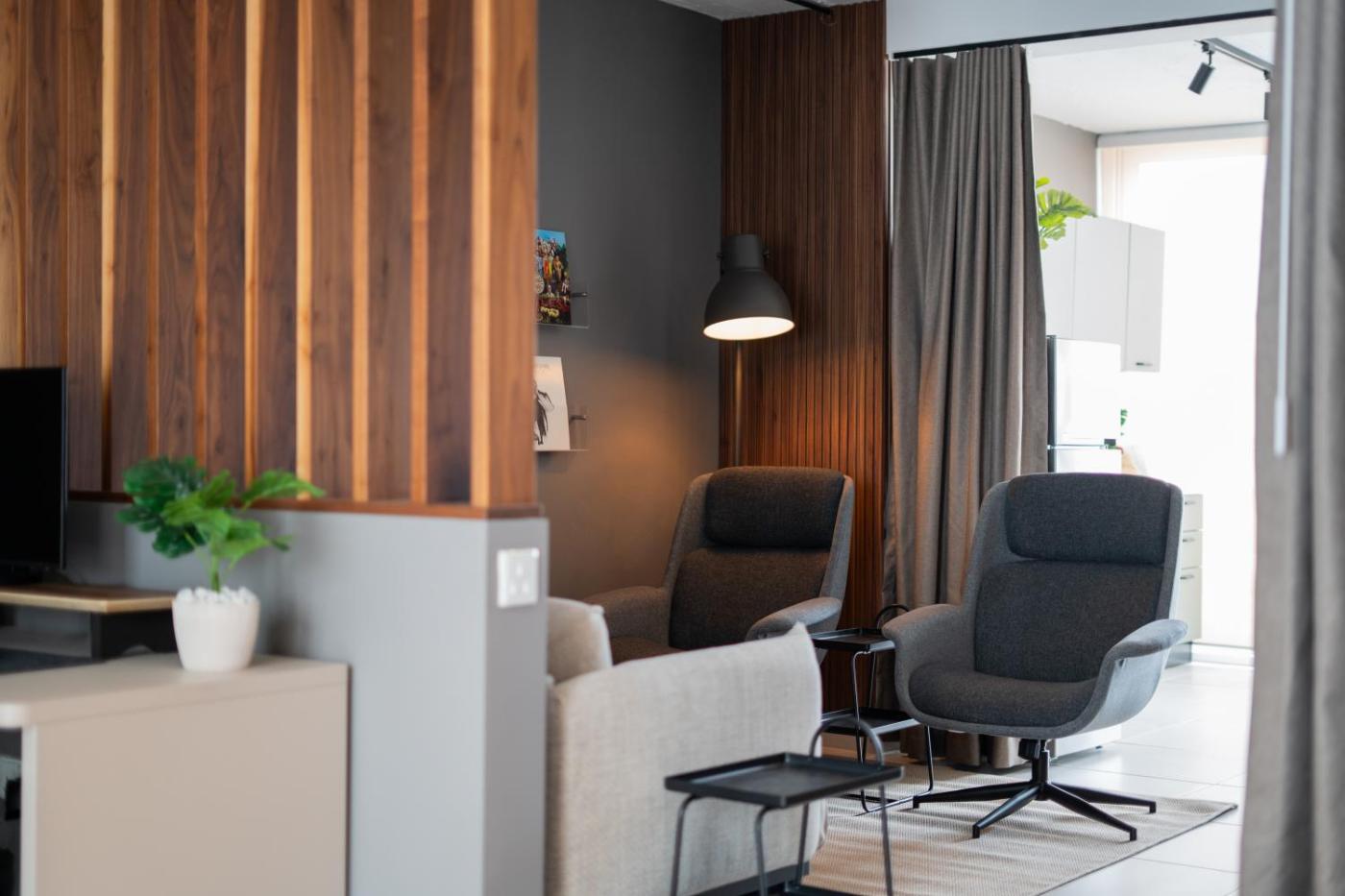 One-Bedroom Premium Apartment. The spacious apartment features 1 bedroom and 2 bathrooms with a walk-in shower and free toiletries. The well-equipped kitchen has a stovetop, a refrigerator, a dishwasher and kitchenware. The air-conditioned apartment offers a flat-screen TV with streaming services, a washing machine, a tea and coffee maker, a dining area as well as city views. The unit offers 1 bed. ;