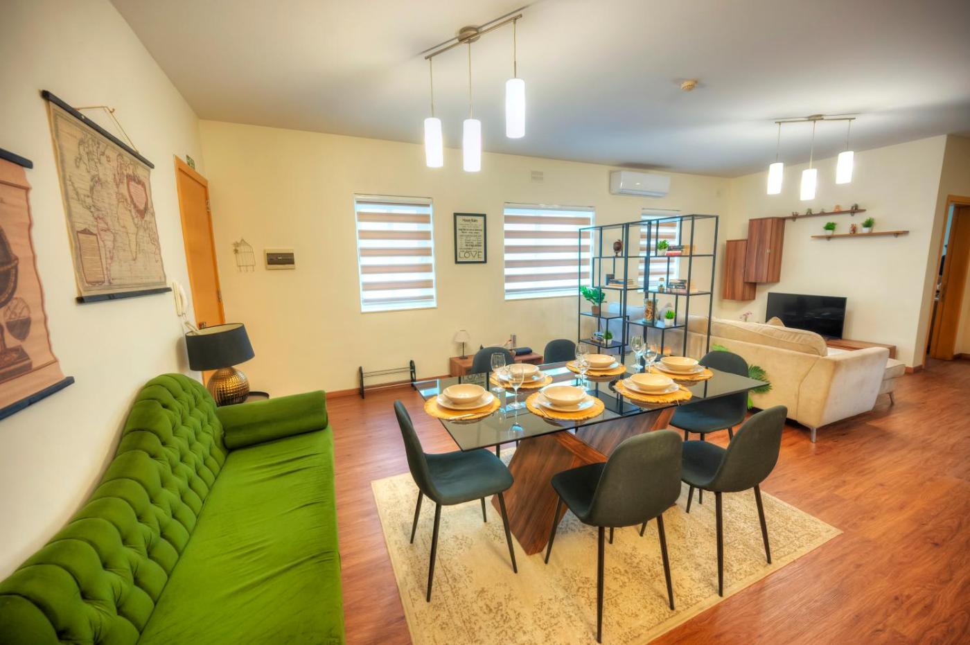 Two-Bedroom Apartment. This spacious apartment features 1 living room, 2 separate bedrooms and 2 bathrooms with a bath and a shower. In the well-equipped kitchen, guests will find a refrigerator, a dishwasher, kitchenware and an oven. This apartment is air-conditioned and has a seating area with a flat-screen TV, a washing machine, a coffee machine, a dining area, as well as a sofa. The unit has 2 beds.