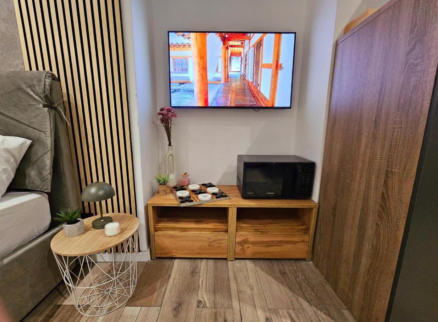 One-Bedroom Apartment. Featuring a private entrance, this air-conditioned apartment consists of a kitchen, 1 bedroom and 1 bathroom with a walk-in shower and a hairdryer. Guests can make meals in the kitchen that is equipped with a stovetop, a refrigerator, a dishwasher and kitchenware. This apartment features a washing machine, soundproof walls, flat-screen TV, as well as winechampagne for guests. The unit offers 2 beds.